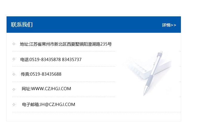 地址:常州市新北區友邦商務大廈1幢16、17層  電話:0519-85101652  傳真:0519-85112595  郵編:213022  網址:www_cz-jiayue_cn.sh-lugang.com  郵箱:xiajifengaa@163.com